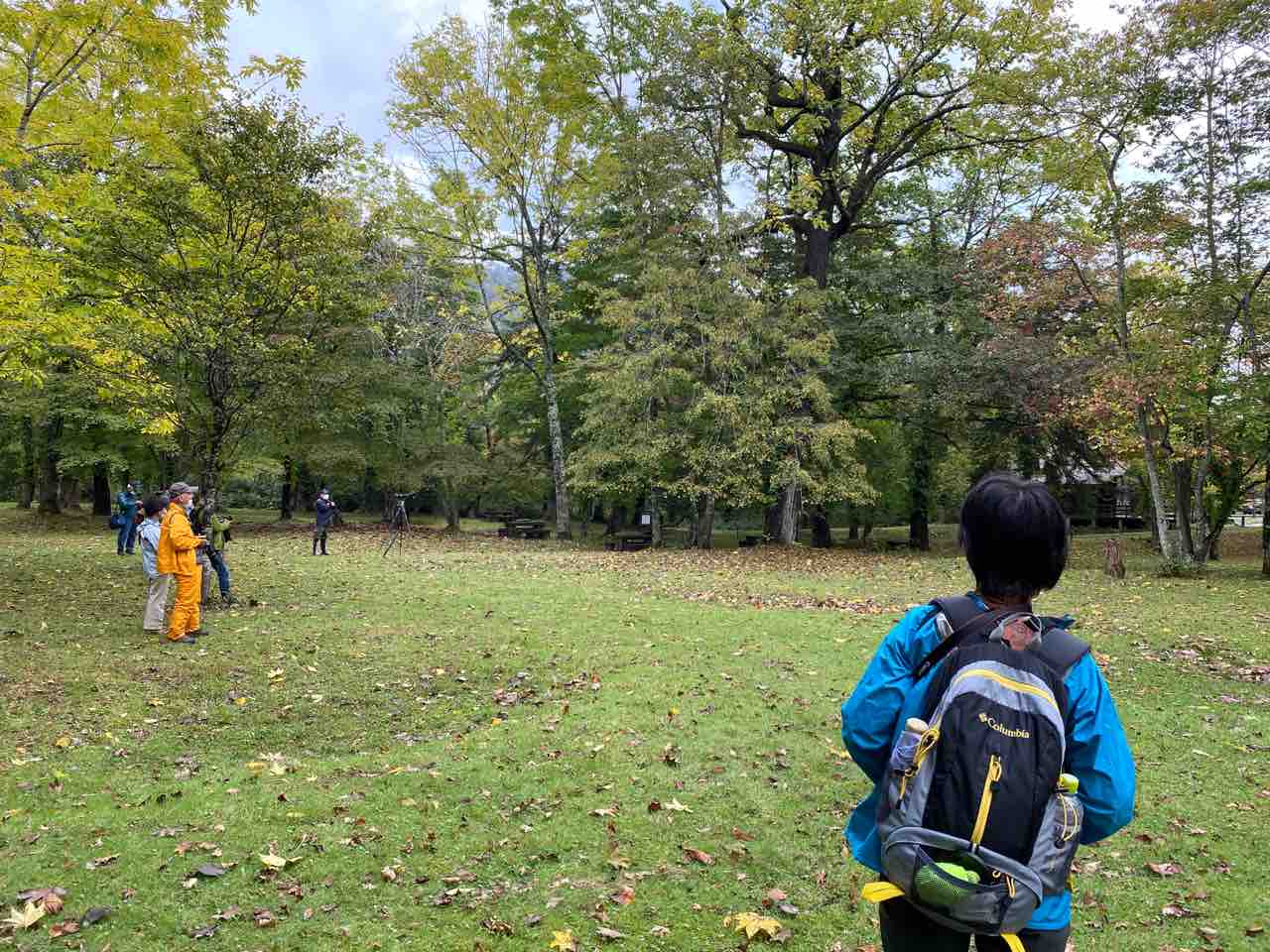 中間地点の駐車場で、参加者の一人が鳥を見ている