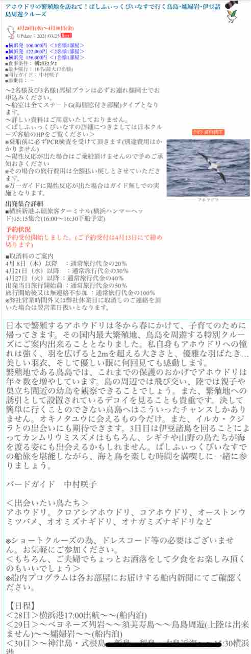 【お報せ】4/16〆切! ぱしふぃっくびいなすで鳥島へ 2021年03月31日 18:29 おかげさまでにっぽん丸で行く鳥島クルーズは満席になりました。正直、驚いていますΣ(゚д゚lll)10人も満たないかと思ってたのに…なんと17名!!ありがたや!!パシフィックヴィーナスも鳥島・孀婦岩・ベヨネーズ島、伊豆諸島周遊クルーズを企画していたので、ワイバードでもツアーとなりました!島好きな人にもたまらない内容ですね。。。孀婦岩見たいなぁ。。。 ↑うーーーん、相変わらずリンクしないなぁ。。 こちらからお探しください絶賛募集中です!! 「お報せ」カテゴリの最新記事 < 前の記事次の記事 > コメント コメントフォーム 名前 コメント 評価する リセット リセット 顔 星 投稿する 情報を記憶