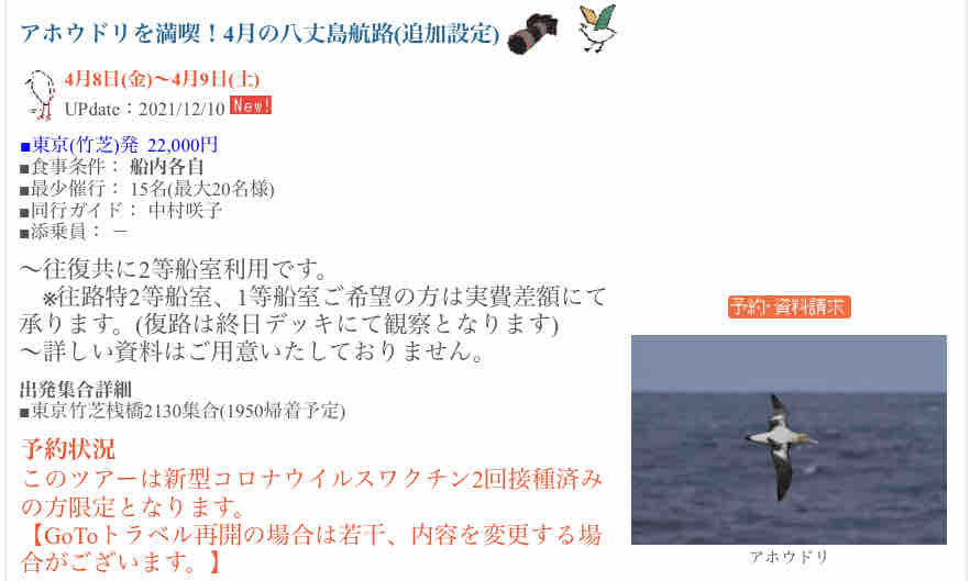 今夜も八丈航路 2022年04月02日 18:39 アホウドリシーズン2回目の 八丈航路のツアーですワイバード今回は初心者の方が多そうなので、ガイドシートを作ってきました。いつもより丁寧め。そして、久々にアホウドリTシャツを着ていきます。自宅襖間スンマソン;アホウドリは沢山いると思うけど、近くでしっかり観察できたらいいなぁー今夜も黄色いお船に乗ってきます! 「ガイド」カテゴリの最新記事 タグ :#八丈航路#橘丸 < 前の記事次の記事 > コメント コメントフォーム 名前 コメント 評価する リセット リセット 顔 星 投稿する 情報を記憶