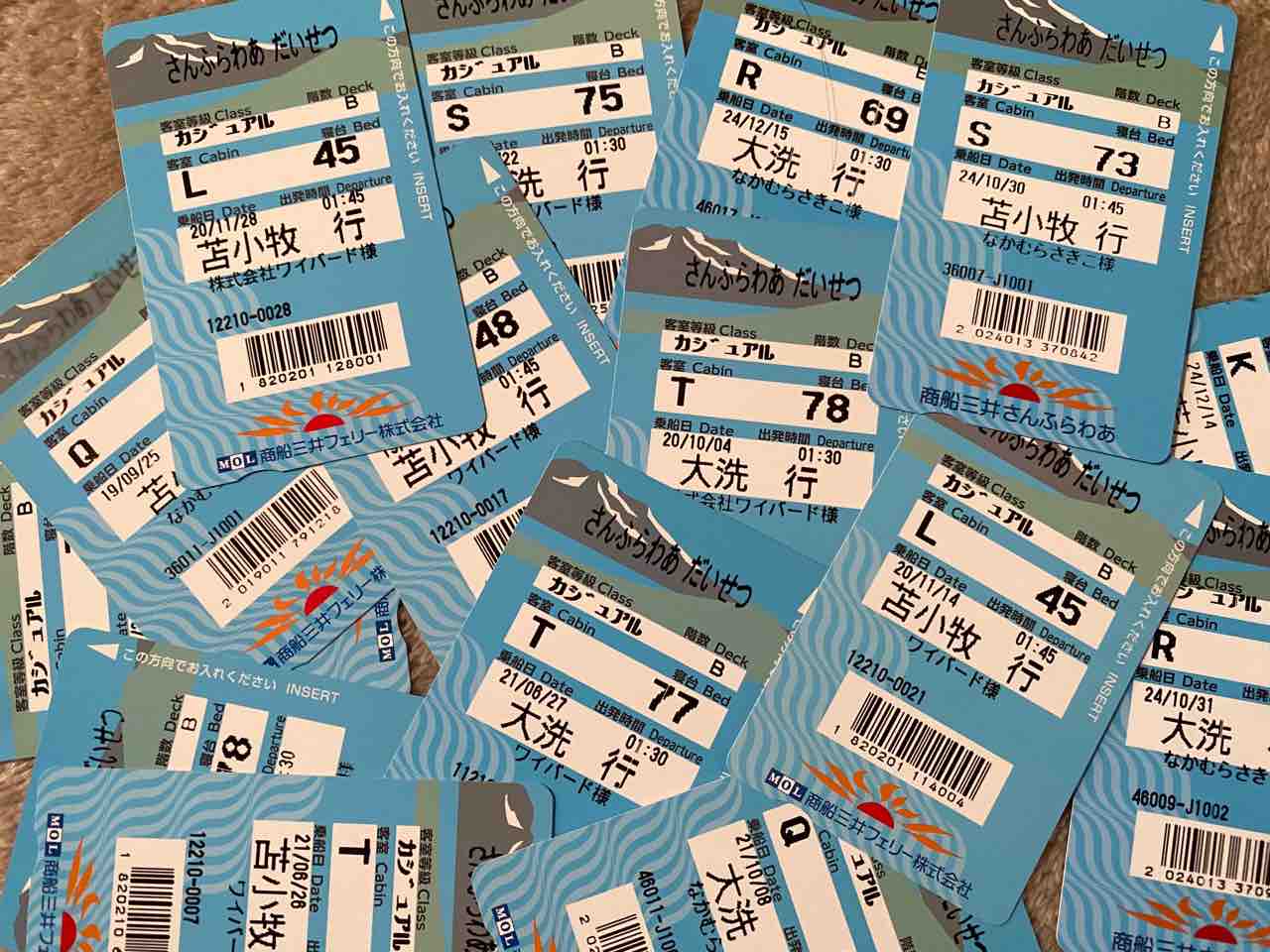 途中から残し始めた乗船券(それまでは捨ててしまってた…) これ以外にもカードタイプになる前にも乗ってるから、何度乗ったかわからない